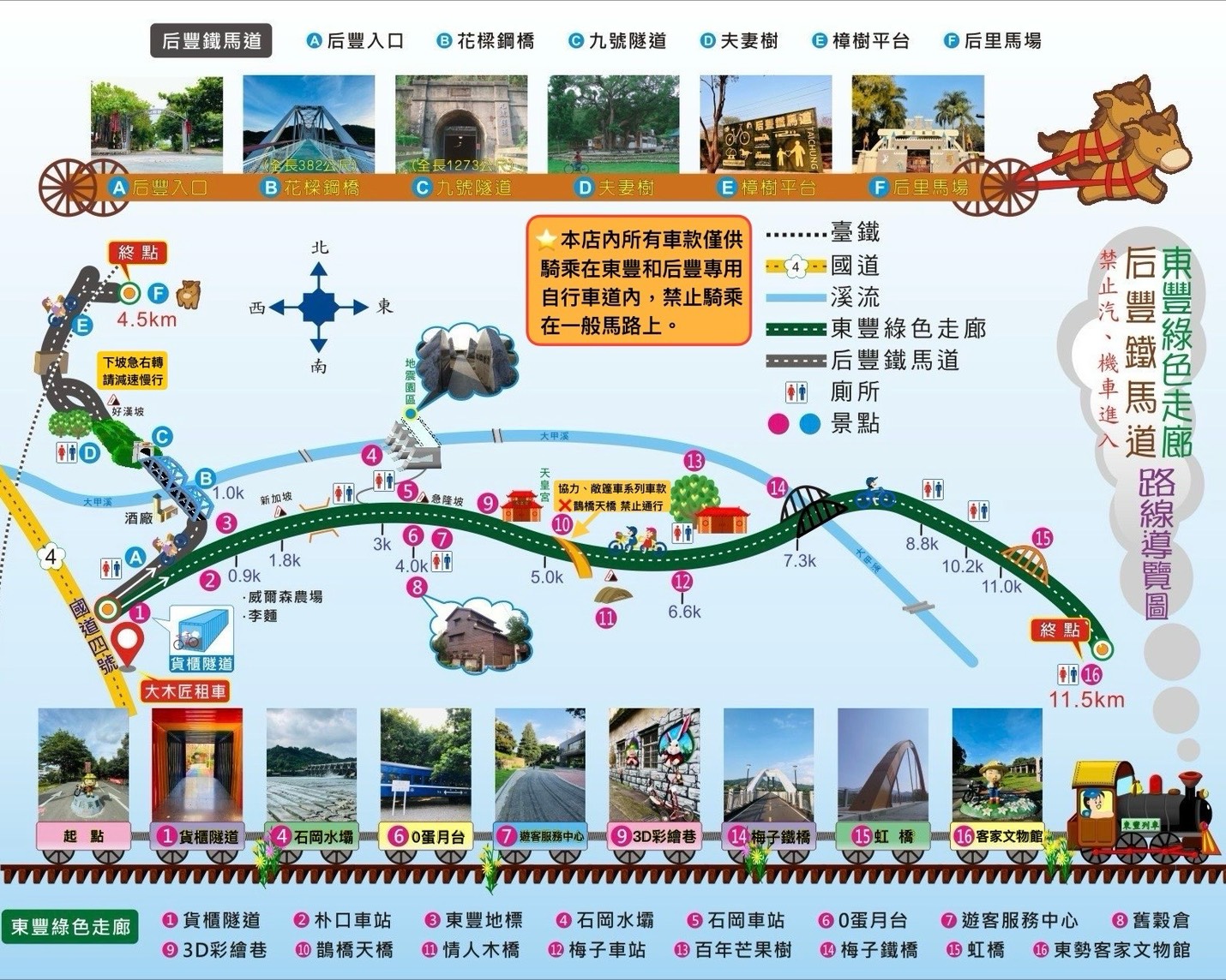 東豐綠廊道:單程11.5km,來回約23km,前段微上坡,回程輕鬆下坡,騎程來回約1小時40分鐘